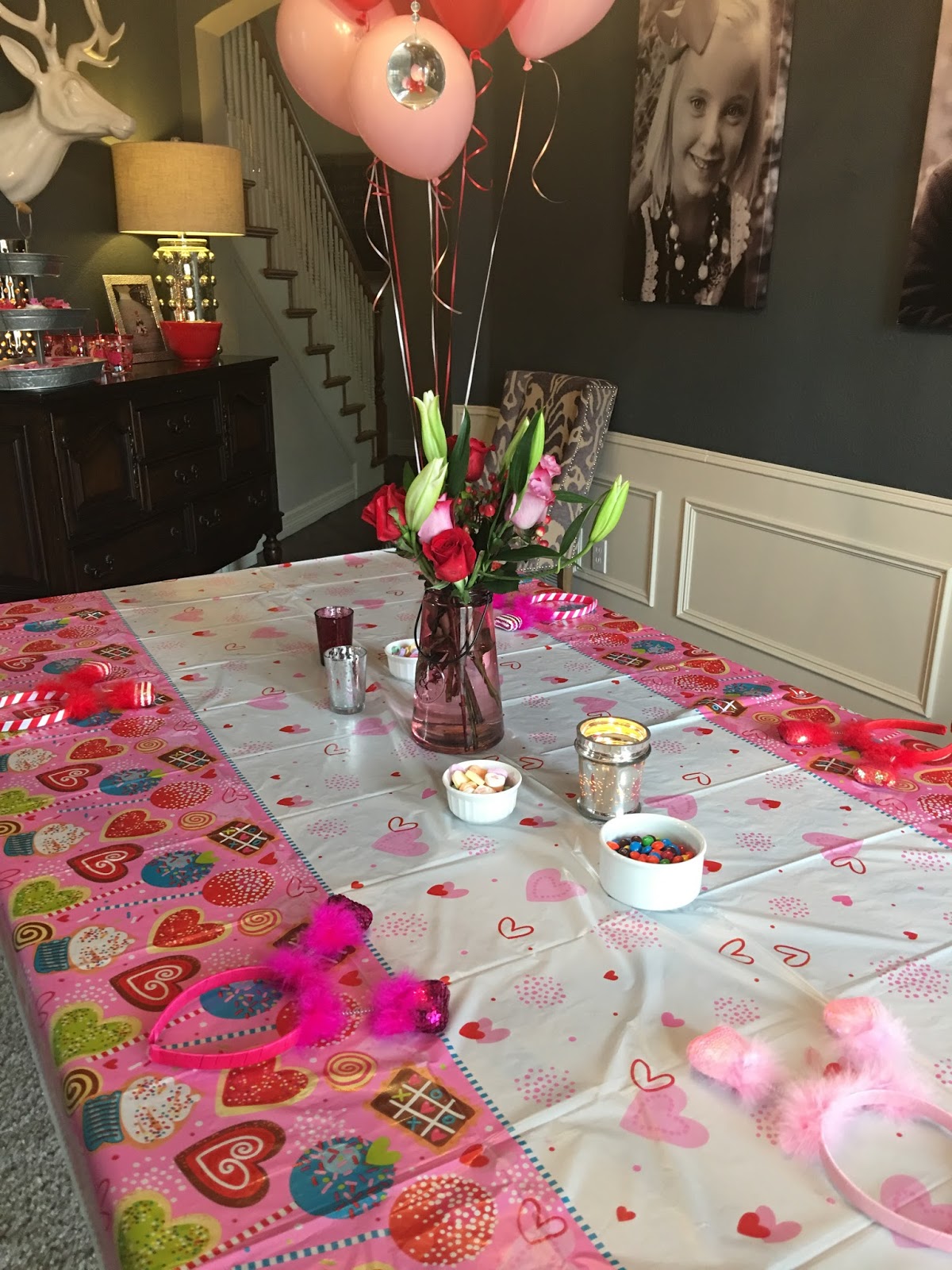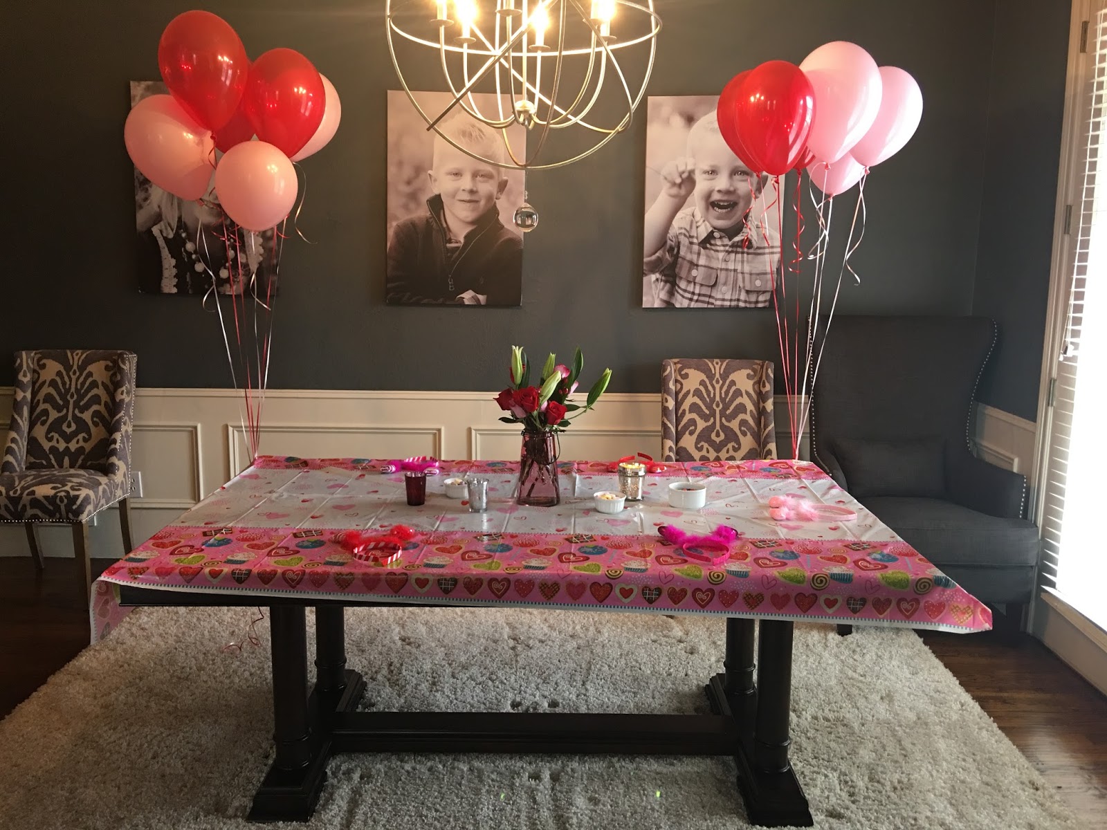 After school on Monday, Ebby Lee invited a few friends over to have a little valentine party. She had asked me (so nicely, I should add) if we could get flowers for the table and balloons. While she was at school on Monday, Bowen and I made that happen. I ordered a couple things…table cloth, party favors, and plates/napkins off Amazon Prime. Goodness, how I love Amazon Prime! We whipped this little party up with only a trip to the grocery store.