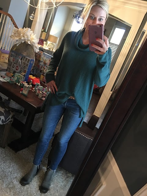 I’m a big fan of gifting a sweater for Christmas…especially one that screams, “WINTER!”. Like this one! You can see my jeans here, my belt, and similar boots (mine sold out).