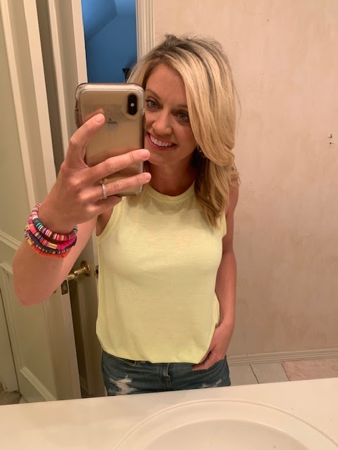 My new favorite summer tank top is THE FIRST thing I want to share today because LOOK how cute! This top is super versatile and can be worn dressed up or thrown on with a pair of yoga pants. I LOVE this summer color! {I’m wearing my normal size.}