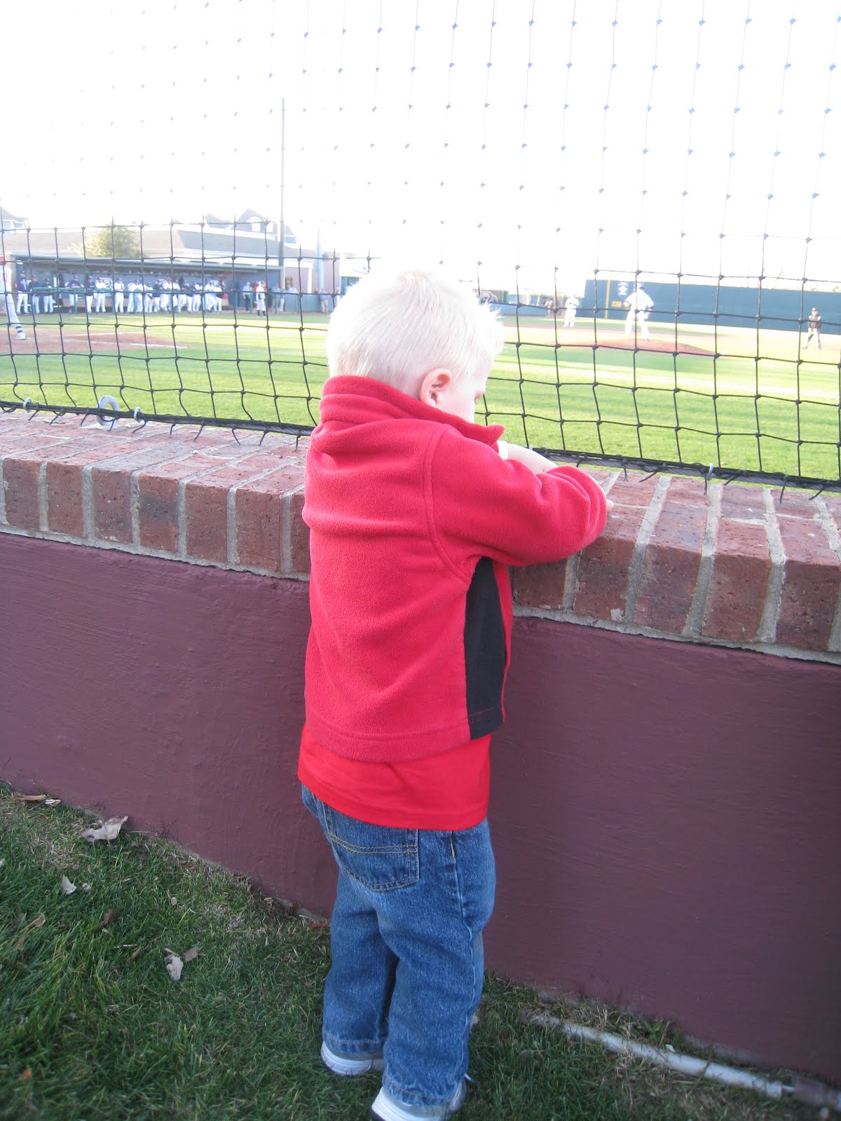 My cousin plays baseball for Southeast Missouri State University. They’re playing DBU this weekend. So, we headed out to the ball game yesterday afternoon. I tried to take a cute picture of the back of Nixon’s shirt. My aunt had shirts made for the kiddos with Kody’s number. Too cute!