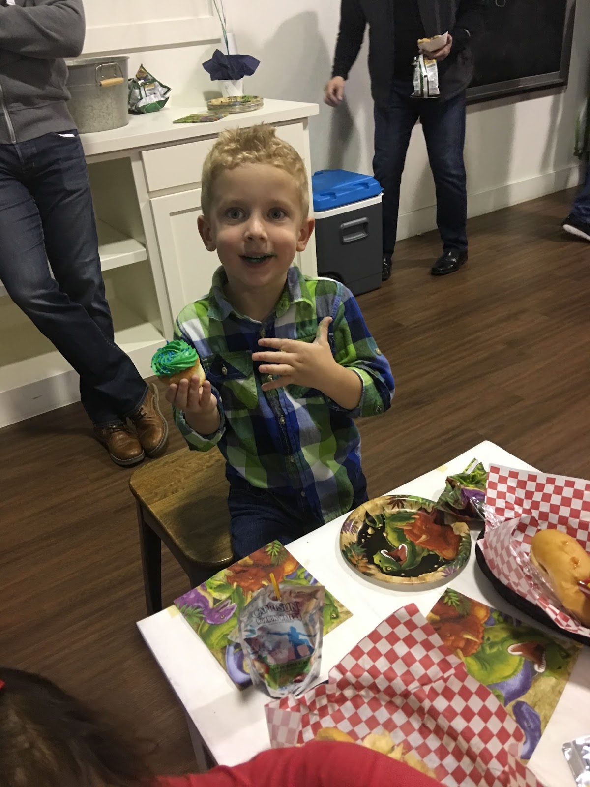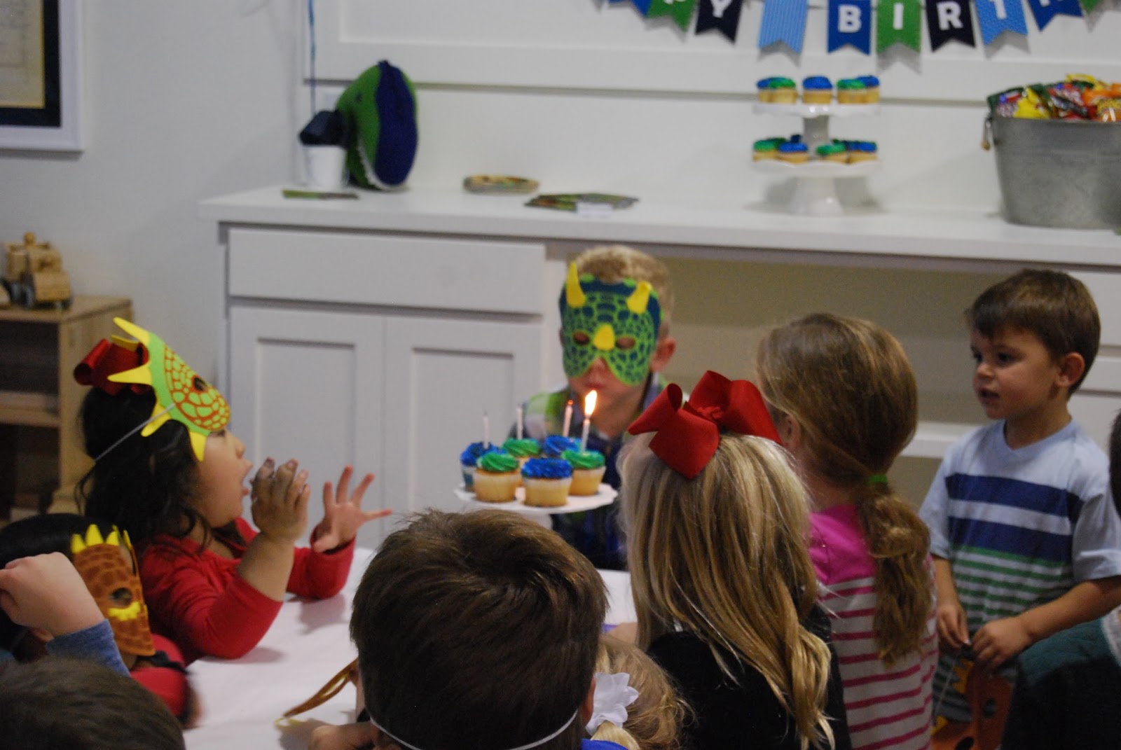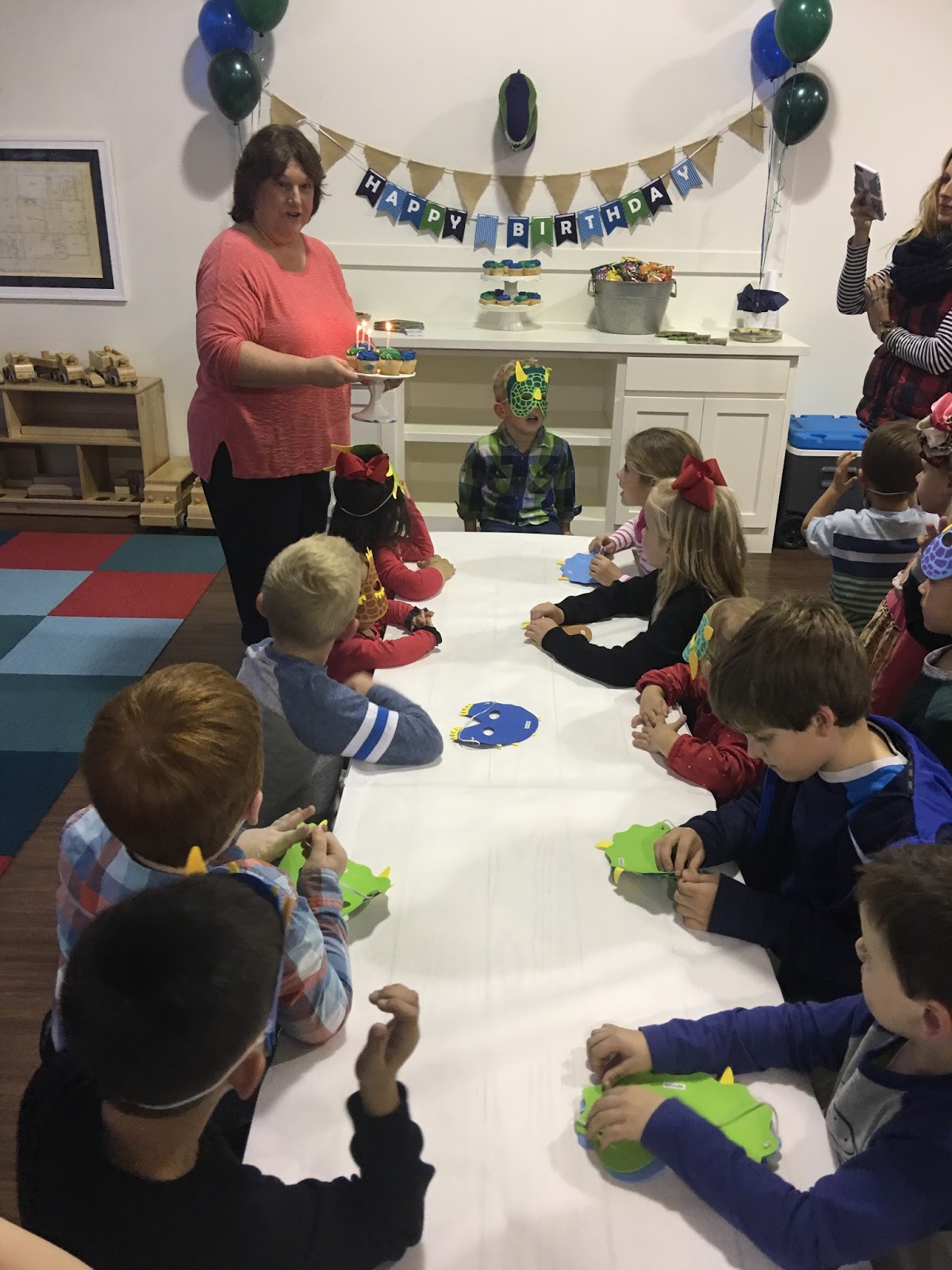 We had cute little dinosaur masks on the table for everyone.