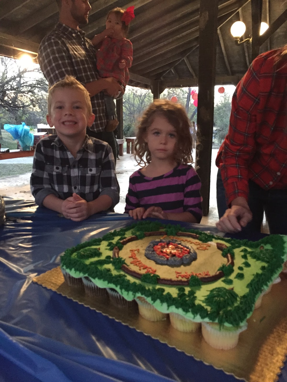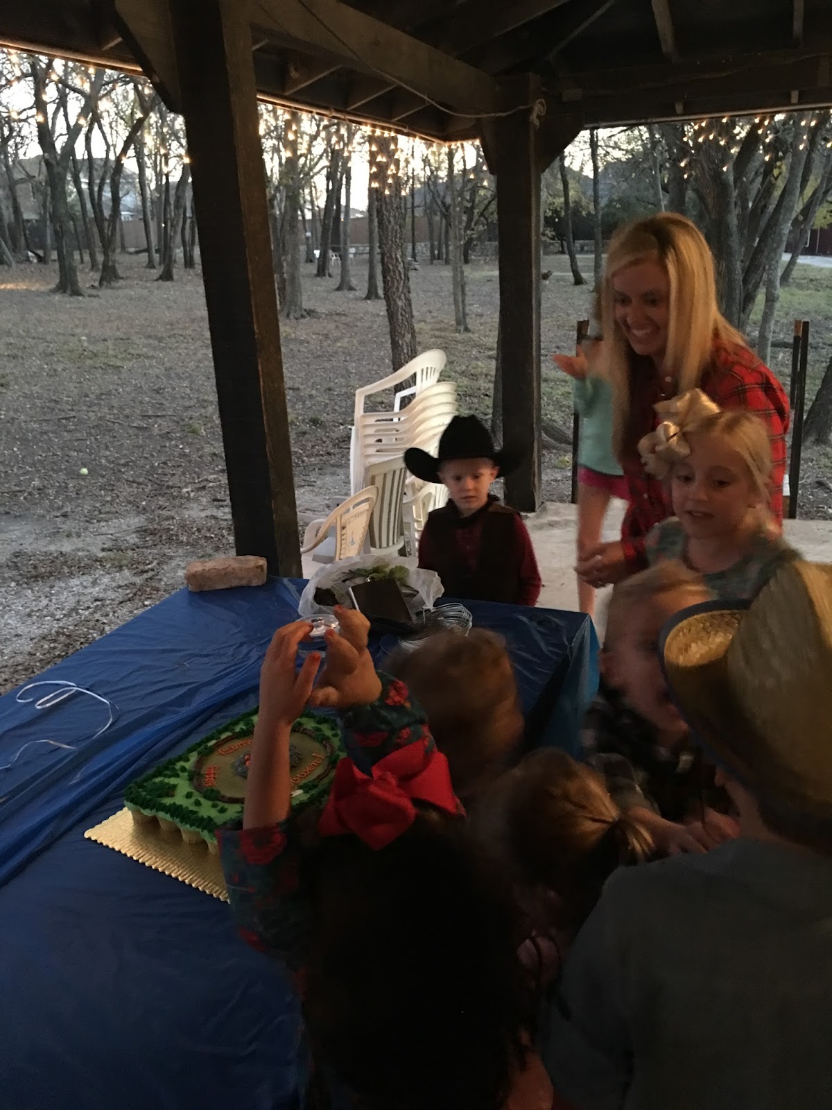 You guys when Ebby Lee turned one-I remember making decorations a month or two before in preparation. I’ve changed a lot since that party. ha! I Amazon Primed western decorations to our house the week before Thanksgiving, ordered the food while in Missouri, and on Saturday (one day before the party) the kiddos and I ordered his cupcake cake from our local grocery store. There were cupcakes underneath but they iced it like a cake.