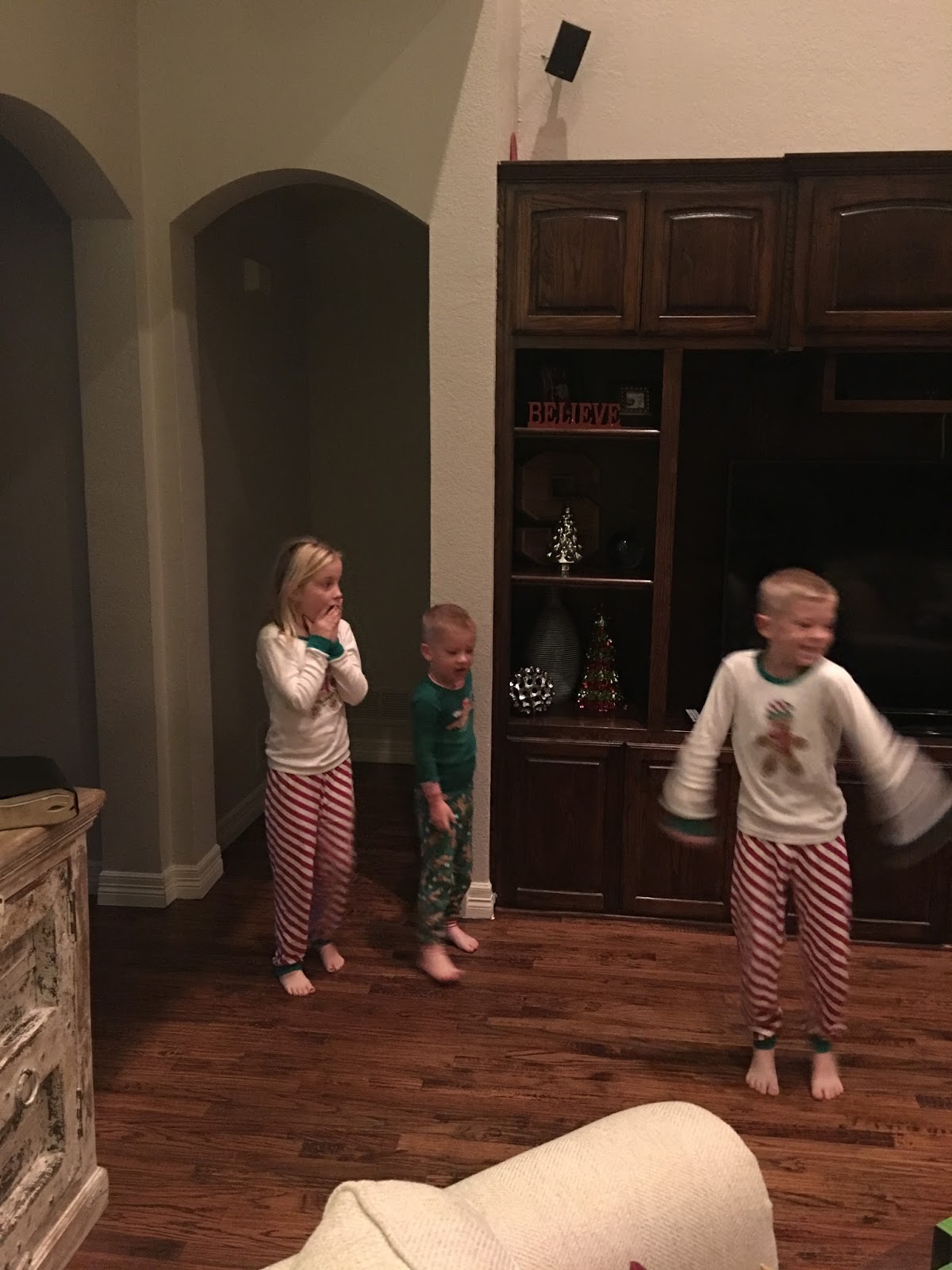 We quickly got pajamas on and Nixon insisted on setting out broccoli and carrots for the reindeer. Those pesky reindeer forgot to eat those! EEK!
