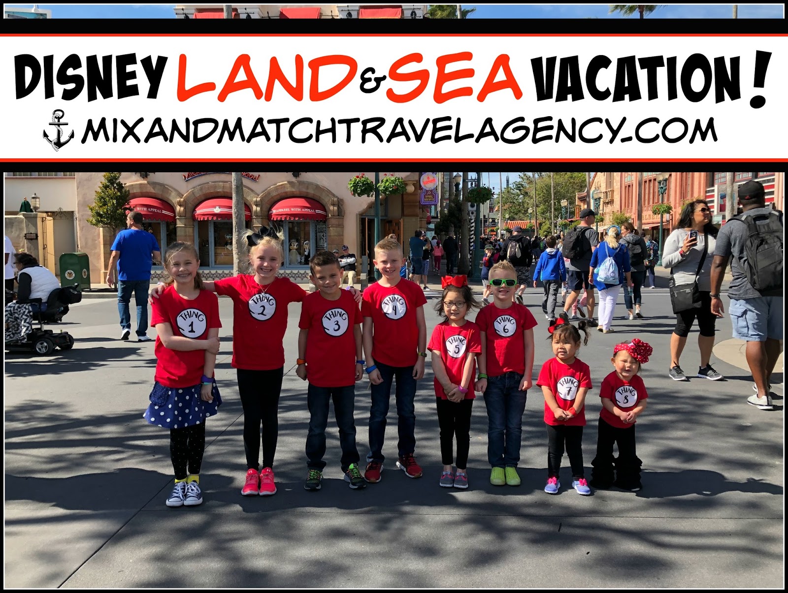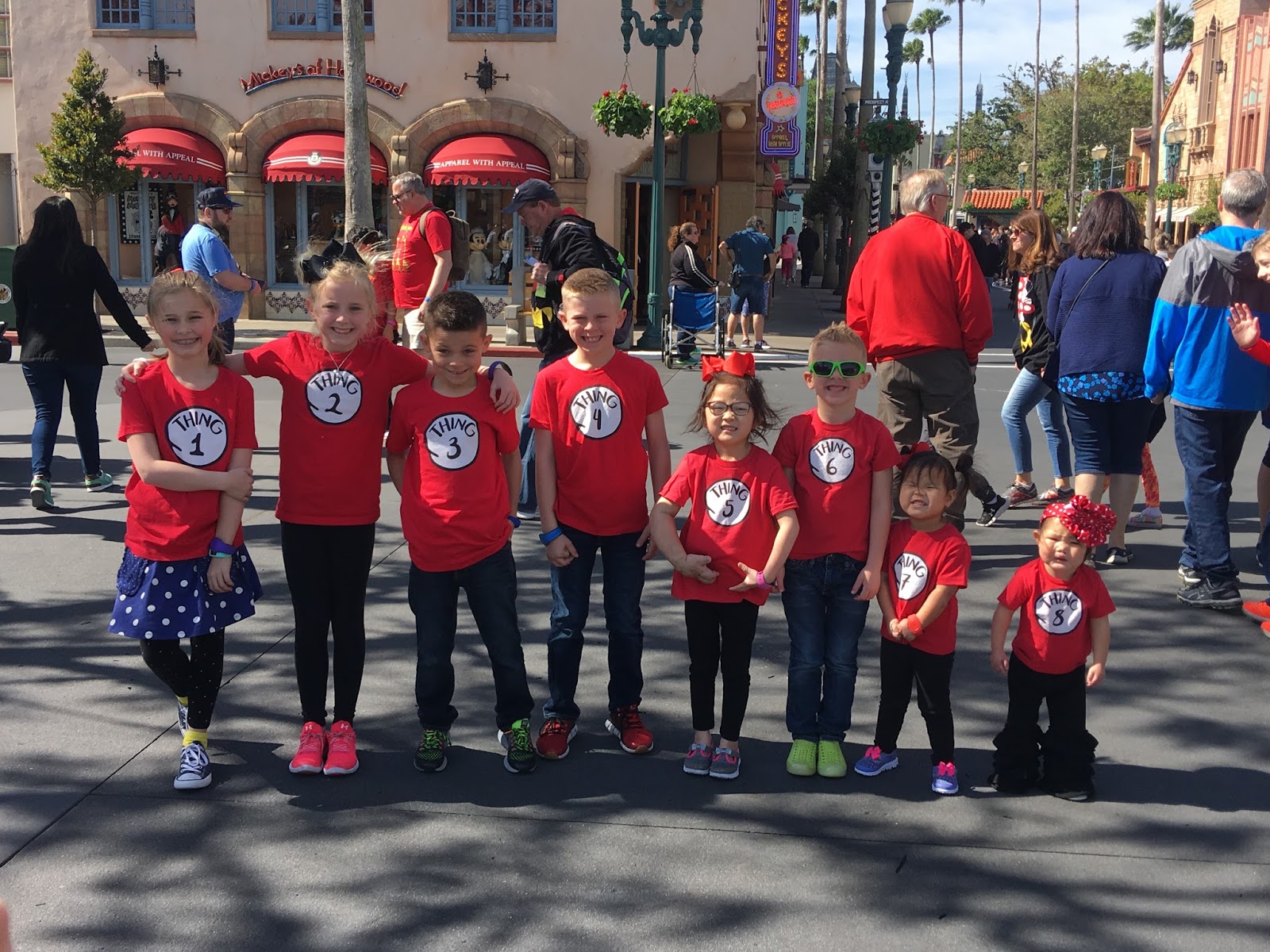 We HAD to get a picture of all of our “THINGS” right inside the park. Shay ordered these months ago. {And yes, we know Dr. Seuss is not part of Disney but with eight little kiddos on a vacation together-we thought it was just cute.} I absolutely LOVE the way this turned out. In the order of arrival… 🙂