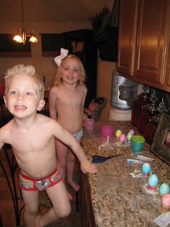 4 April 2013EasterBy Erika SlaughterDying Eggs… Friday night we had no plans so we had an early dinner so that we had plenty of time to dye some Easter eggs. And…apparently you need to only be in your underwear when you dye eggs. 🙂 The eggs looked fabulous!