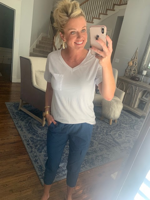 This stay-at-home mom outfit is coming at you from Amazon and Target. Both are easy, super affordable, and new FAVES! This v-neck tee is light weight but not see through and it’s a loose fit so I ordered my typical size. The joggers I spotted on a girlfriend and needed the details! They’re super comfy but I’d recommend sizing down one! I have a pair from Athleta that are super similar. In fact, I have a fun post coming up next week with these! I’d suggest checking your store since so few sizes are available online.