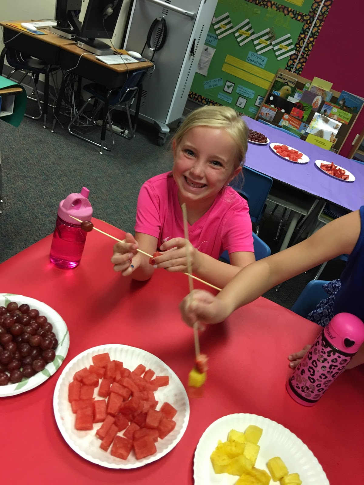 First grade had Aloha Day to say goodbye to first grade. There were stations set up and all the groups rotated through each station. A station hit was definitely the fruit kabobs.