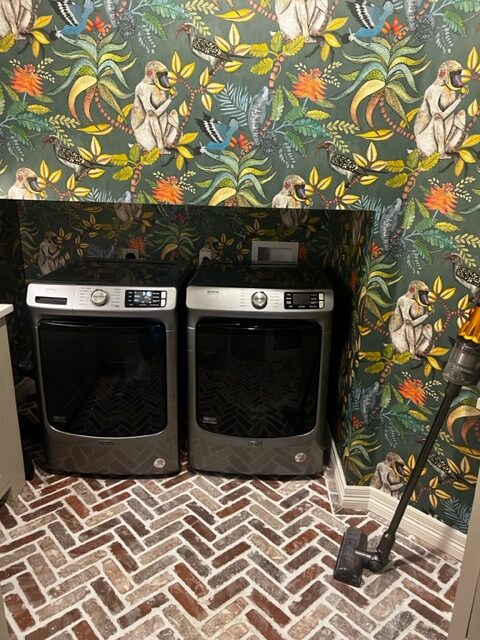 *We got our brick floor at Floor & Decor. This is our exact flooring. I absolutely LOVE it in the laundry room. I use my Dyson, a broom and mop it just like my wood floors. It’s easy to keep clean but it’s not in a well trafficked spot. I do think it’d be a little trickier in a high-trafficked area because it’s a bit tougher to clean in the grout. I have to be more intentional. Know what I mean?