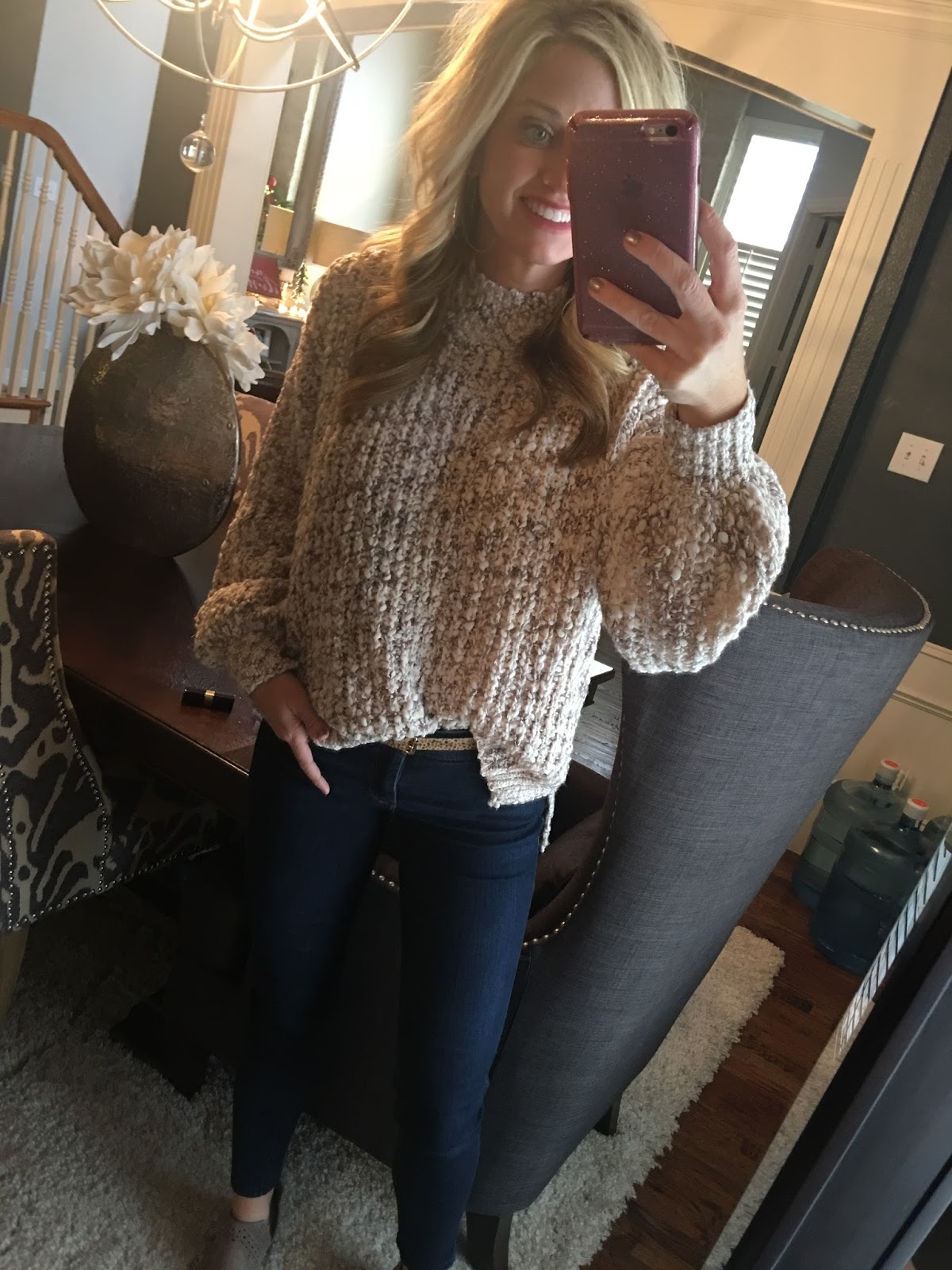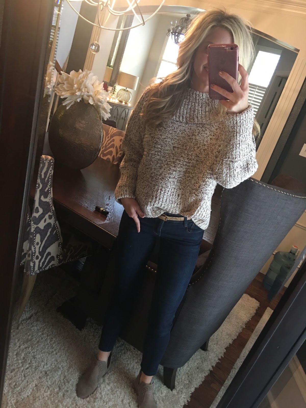 I have ALL the heart eyes for this sweater. I LOVE the color…it’s a white, ivory, grey combo. It can hang ALL WINTER LONG! The sleeves on this one are fun too. I’m normally a small in tops, but for this one I ordered a large and I LOVE it! I paired it with these dark jeans, a leopard belt {mine is sold out but this is super similar}, and these booties.