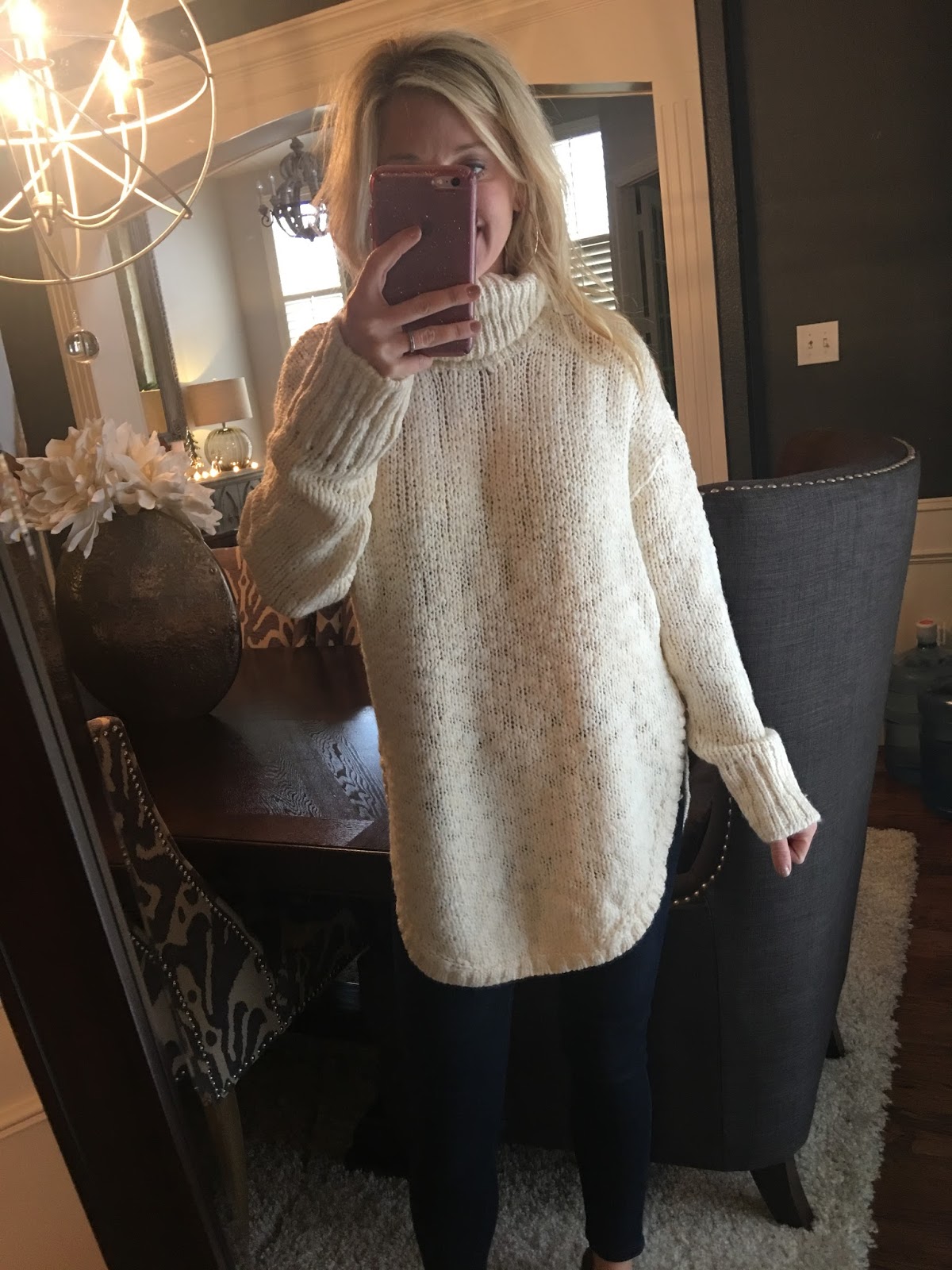 I have two sweater tips I learned this year…1. In the past, I’ve always ordered my normal size in a sweater and let me tell you…that is not the way I prefer a sweater. I like them a bit oversized. This year I’m ordering one {if not two} size up. If you’ve never given this a shot, you might want to try. 2. I prefer a front-tuck with a sweater. Some sweaters tend to be on the short-side for us long-waisted girls but with a little front tuck IT DOESN’T MATTER! You should grab a cute belt and try this tip ASAP!