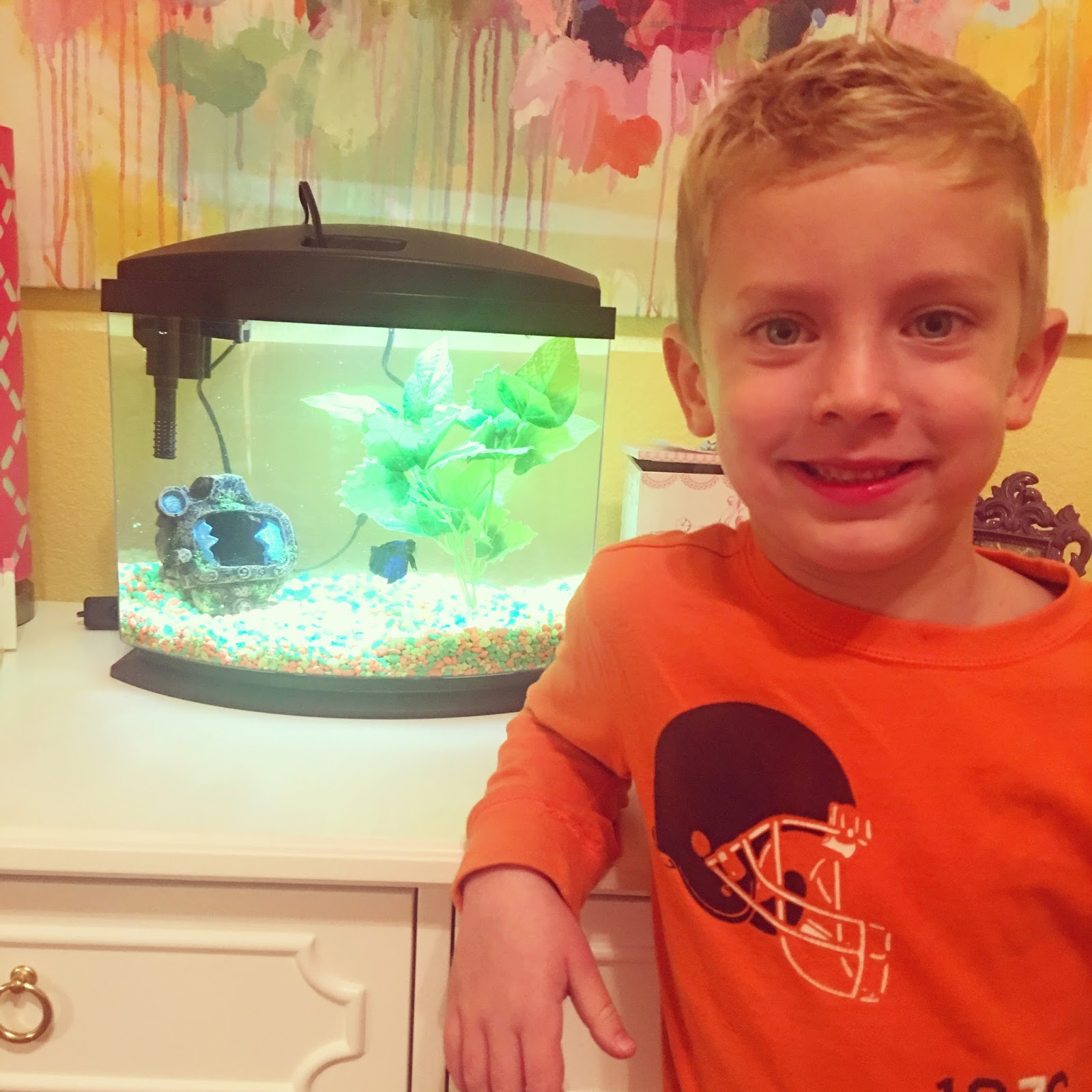 Let me introduce you to the newest member of our family, Blue Sparkle Diamond Slaughter. The Shull family gifted this fish to Bowen for his birthday. And Bowen has never been more excited! I’m pretty impressed with our pet skills…Blue Sparkle Diamond had to stay in a little plastic bowl for only three days, then we had to transfer him to the tank with special water-at room temperature, and feed him just the right amount. It’s been almost two weeks and I’m so happy to report…Blue Sparkle is doing great!