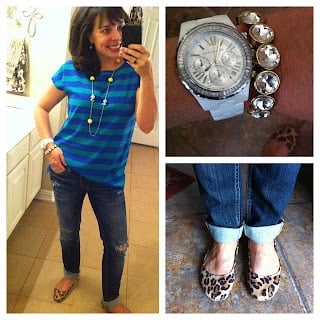 I had a little help from my trusty photographer, Ebby Lee. 🙂 It’s kind of blurry and dark. She’s got a long way to go with her photography skills…but you get the idea. Striped shirt, distressed Vigoss jeans, and leopard flats.