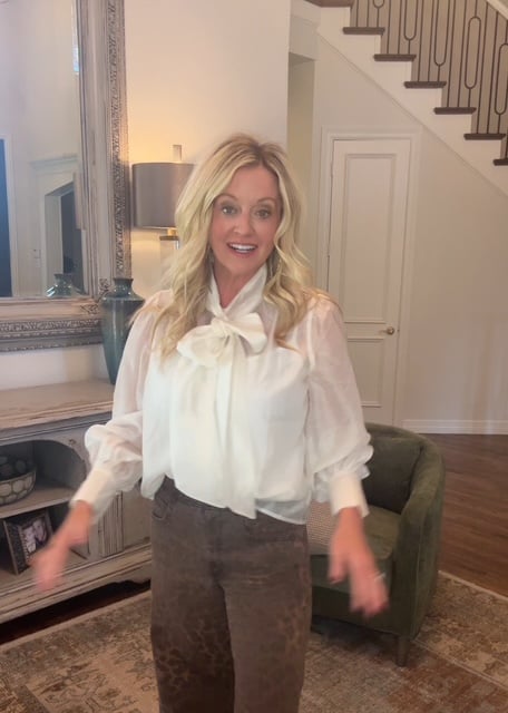 #5 White Blouse-I’m having a moment with the tie front tops. They just give an extra “something” to an otherwise average white blouse. Again, any white blouse would do but this one is extra fun.