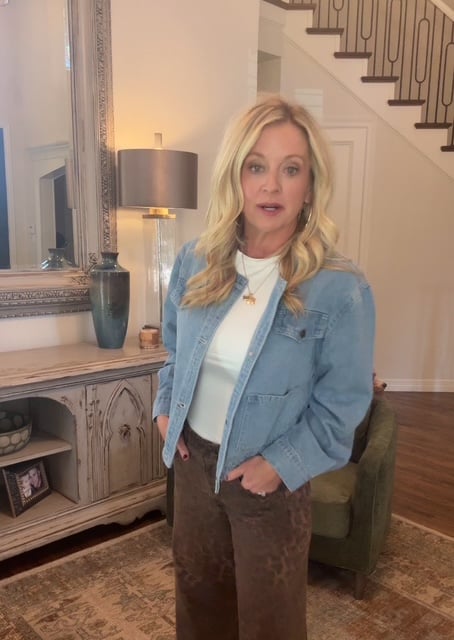 #6 Denim Jacket-This is an updated “crop” version. You can add any denim jacket…moto, standard denim, etc. That pop of denim with the leopard is really cute!