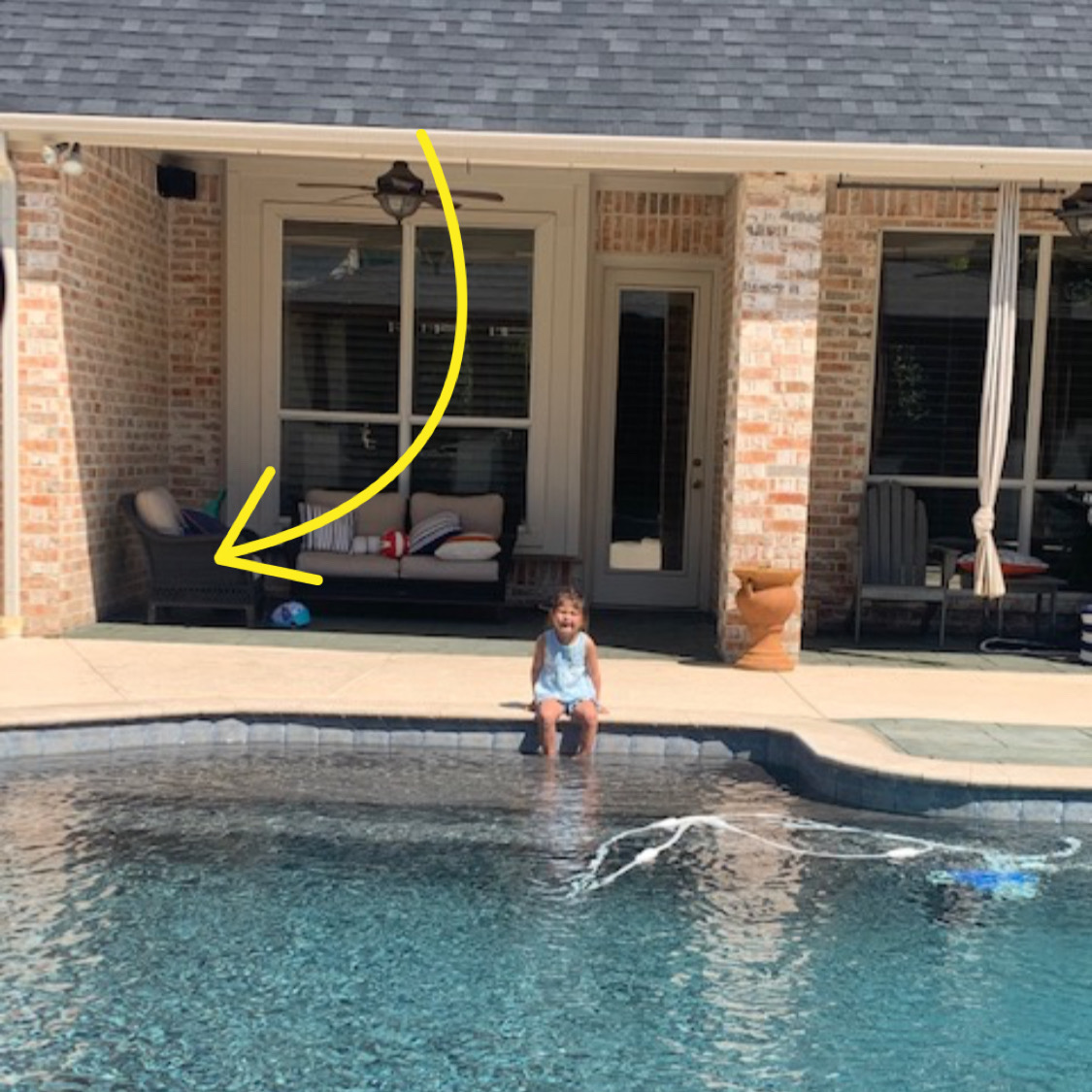 The pool toys can be a LOT so we have a storage bench {similar to this one} right out back. We’ve moved some patio furniture around and it’s now right where the arrow shows. {It’s rained both Monday and Tuesday here so I couldn’t sneak out to snap a picture that was bright enough for you.} We keep our pool toys at a minimum, but everything used for the pool goes inside…goggles, pool toys, noodles, buckets, etc. At one point we had our pool storage bench around the side of the house so it wasn’t visible but often times our toys didn’t make it back in the bench. Having it right beside the door makes it so much easier for everyone.
