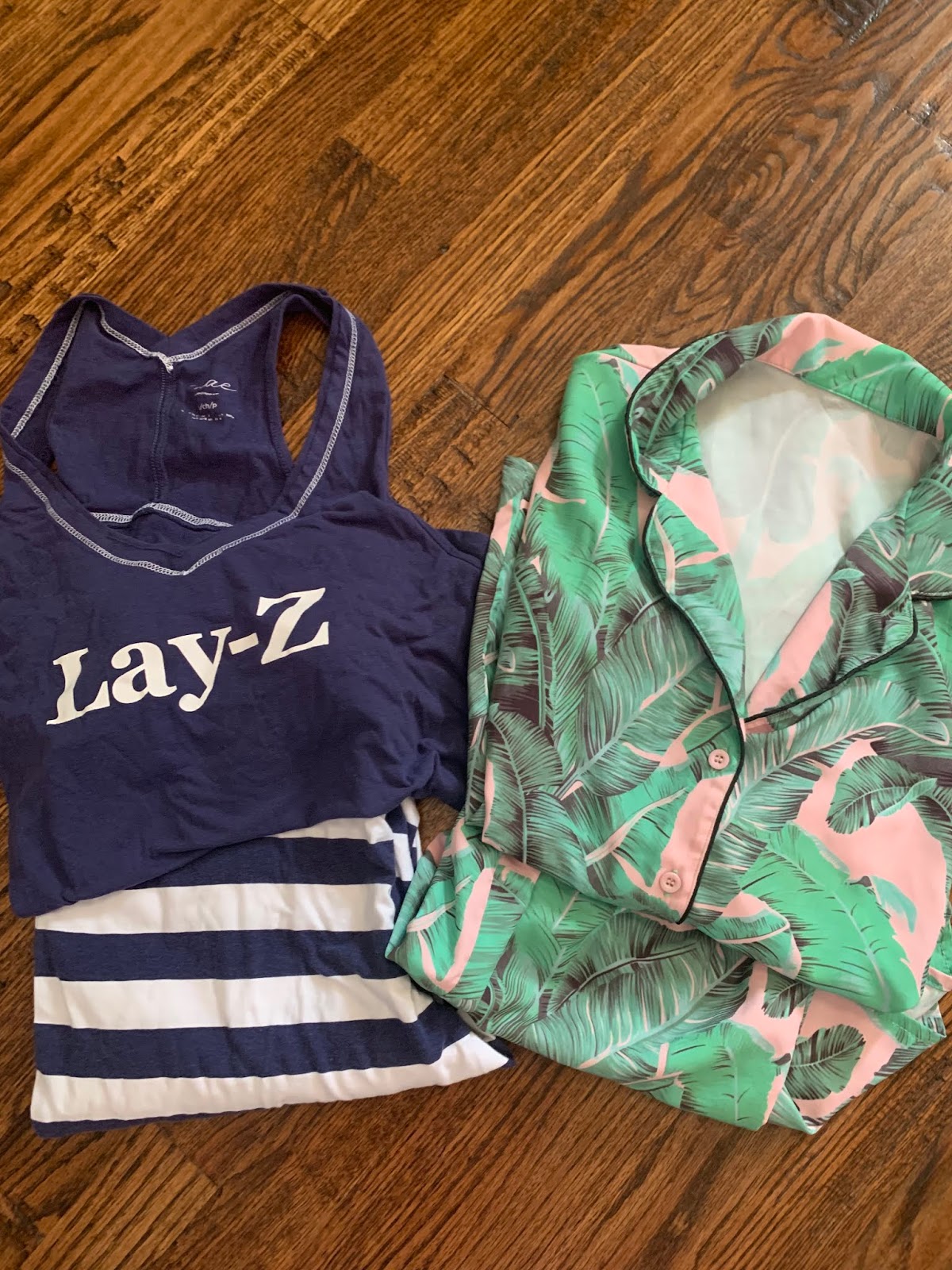 Two of my most comfy pajamas made the cut for this trip-again, BOTH from AMAZON! {Navy stripe-sold out but similar and palm print}