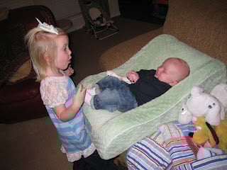 This is what most mornings look like…Ebby Lee dancing and singing in front of Bowen. They both work so hard to keep him entertained.