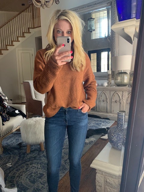 Let’s talk about that top…it looks like it’s a black/camel but in person it’s more of a navy/camel. I still think it pairs so well with those boots. It’s a fun, sassy look that’s a little out of my normal comfort zone but I like it. I ordered a small in the top and thought it fit well but the neck hole…is really small. I wasn’t sure my head would fit through the hole-it was that small, so if you’re in between sizes, I’d go up.