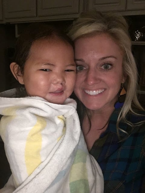This past Thursday started with a bath for this cutie. If you’re wondering why she’s wrapped up in a beach towel, well that’s easy. It’s because the pile of clean towels was overflowing in the guest bedroom where I was folding them but did I put them away? Absolutely not. So we used a beach towel. 🙂