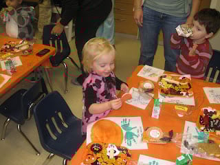 Yesterday was Ebby Lee’s Fall Party at school. Last year (since she was in the baby class) they didn’t really have parties or any big celebrations so this was a BIG deal. Poor Nixon missed out b/c he’s in a baby room. But…luckily, he never knew kiddos were partying all around him. I asked Tab to go because I’m teaching and couldn’t really come and hang out for the party. Of ALL days, his big boss was in town yesterday so he wasn’t really sure if he’d be able to leave work at 1:00 to make it to a party BUT…Daddy pulled through and surprised her!! We hadn’t said that he might come just in case he couldn’t make it, but he said that when he walked in she was SO excited!! 🙂
