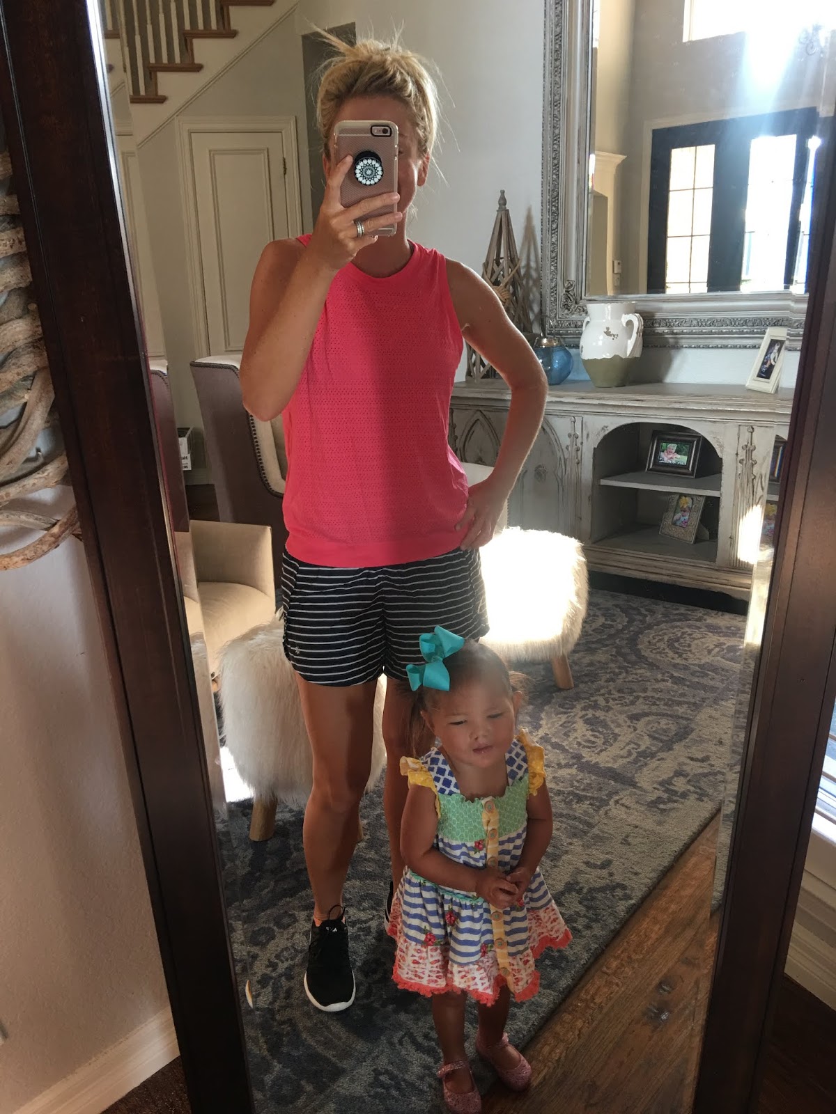 My little shadow and I were all ready for the gym! I got lots of questions about my shorts. You can find them here. Looks like the stripe is sold out, but they come in several solid colors.