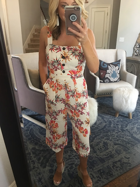You guys. I have a confession….I love a jumpsuit. I think they’re so stinkin’ cute, but a ton of them are just too short for me since I’m long-waisted. This one, however, WORKS! The floral is a red, pink, orange combo and there’s a small part of your back showing but my strapless bra strap was covered completely. If you’re a jumpsuit fan, check this one out. And you should take a peek at these wedges too.