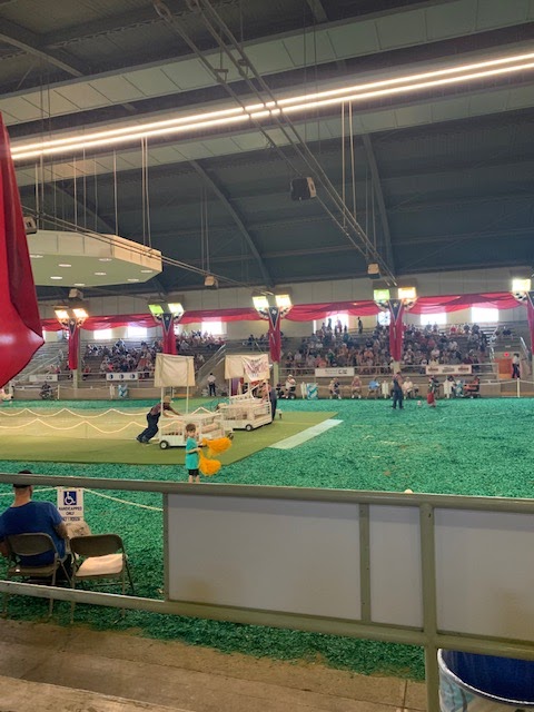Then it was SHOW TIME! I laugh at myself every year because I love the shows! This year Tab limited my show loving self to two shows…the PIG RACES were up first. The inside of this barn felt like the surface of the sun. My lotioned up legs were sliding Britt right off my lap so I didn’t mind our show limit one bit. We shared a Fletcher’s Corny Dog while we watched because it’s the FAIR!