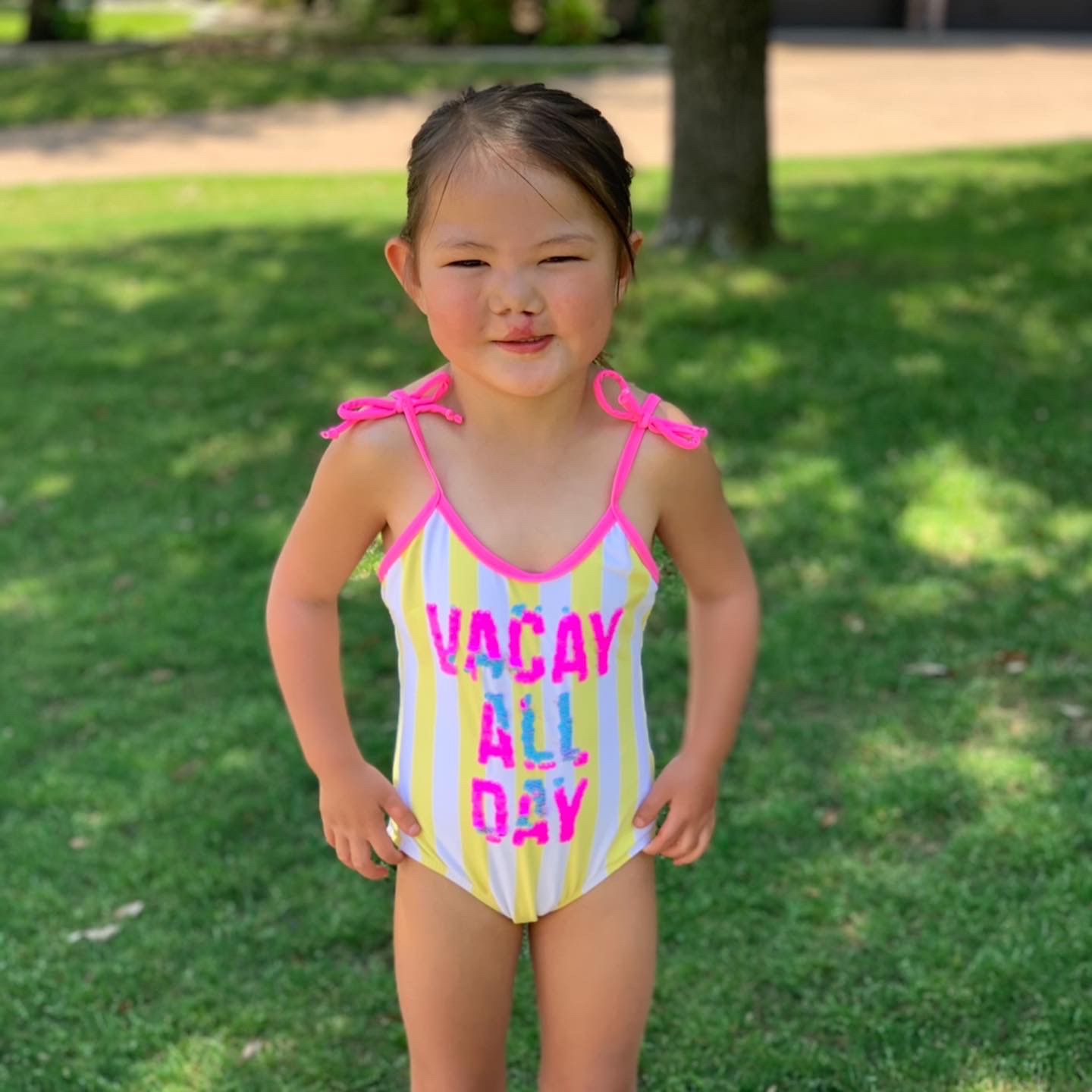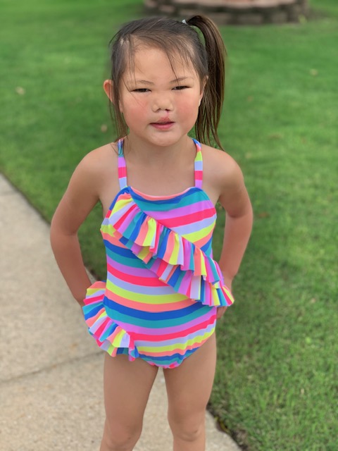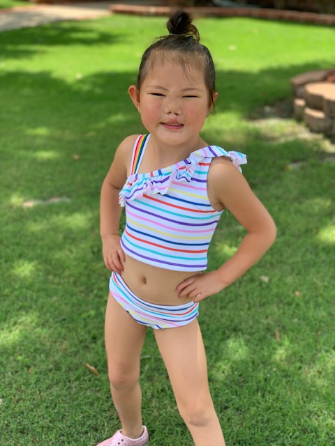 Since we swim a lot all summer long, I usually buy several swim suits at the beginning of the season and then they wear them out almost by the time school starts. Just recently I shared some swim suit ideas for beginner swimmers…bright colors that don’t blend into the water. {And many of those suits are on sale right now!} I have a few of those suits pictured so you can see how cute they are in real life.