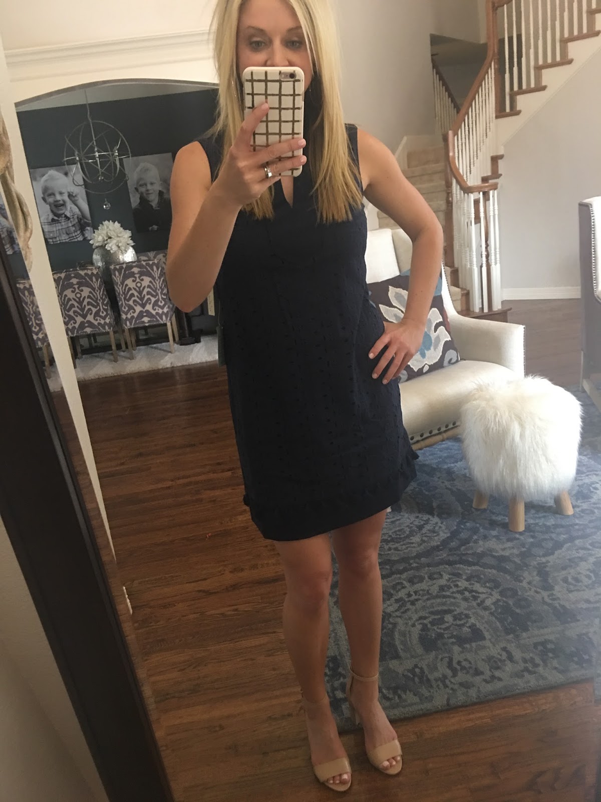 This Mandarin collar shift dress was so comfortable. It’s hard to tell from the picture but it had a little overlay with cute designs that are also navy.