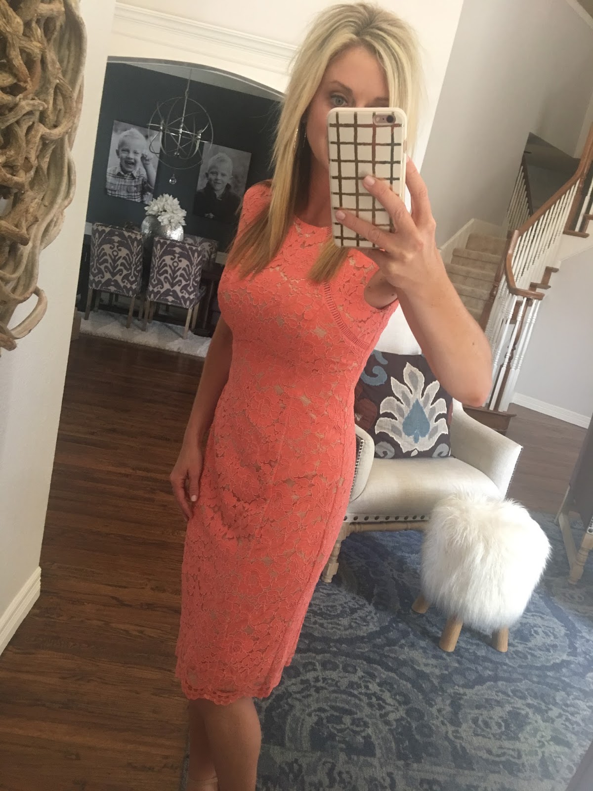 This coral lace dress is a little different than something I’d normally gravitate towards, but I tried it on and loved it.