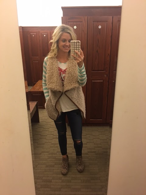 Ebby Lee had a little valentine party after school on Monday for a few friends. This was my outfit…top is a boutique last year, vest is the same, jeans are sold out, and leopard option is gone but this style booties are on sale.