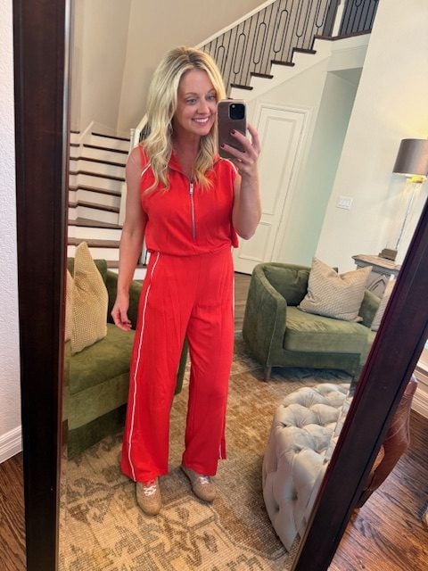 *Spanx Dupe Jumpsuit-Do you guys recognize this as a VERY similar option to the Spanx Jumpsuit? Here are my thoughts…I keep seeing that Spanx jumpsuit show up in my feed but just couldn’t justify the price tag. This option is really solid for the price. I tried to order in black but it wasn’t going to arrive for weeks so I gave the red a shot. I think the black would be the preferred color choice. The material is soft but a thinner material {and it wrinkled}. I could barely wear the medium for the length. If you’re taller than 5’7″, I think it might be too short. It does open in the back so you don’t have to get completely undressed when you’re in the restroom. Always a plus!