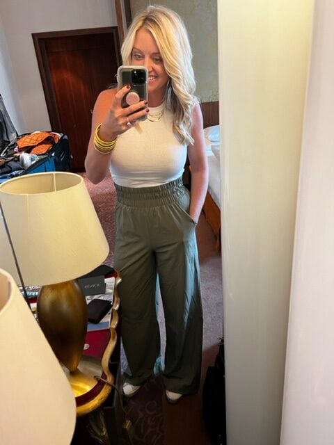 THE BEST Travel outfit! I paired this tank with the most comfy pants ever! And then I had my denim jacket on the flight just in case I got chilly.