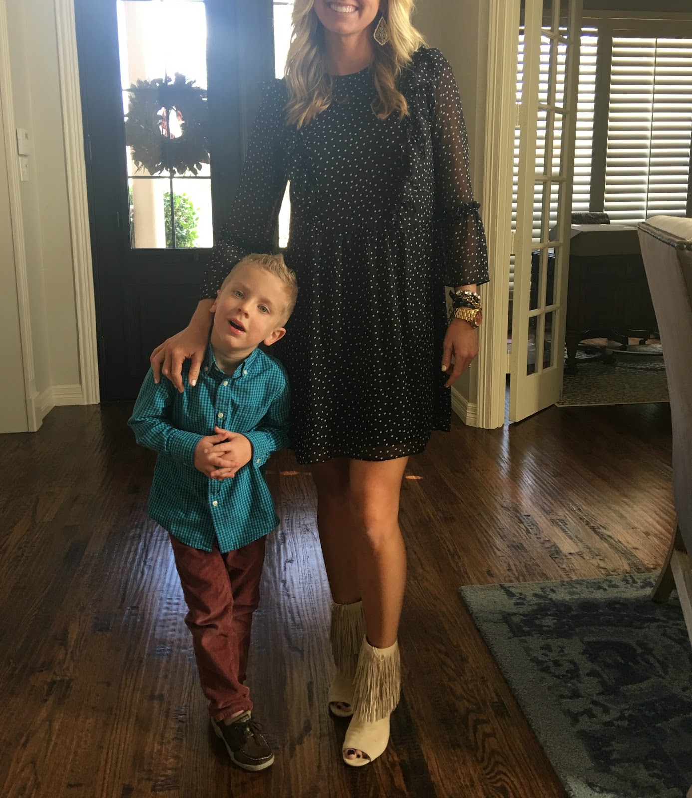 Don’t mind my missing head. Ebby Lee took this picture of us and happened to catch me in that weird mid-blink-half-dazed look so I cropped my head right off. For church this past week, I was sporting this dress with some fringe heels. Mine are sold out, but these are similar. I’m pretty sure this dress can span the seasons…with a jacket and tights in the winter, booties in fall, like I’m wearing it for spring, or with wedges in the summer.